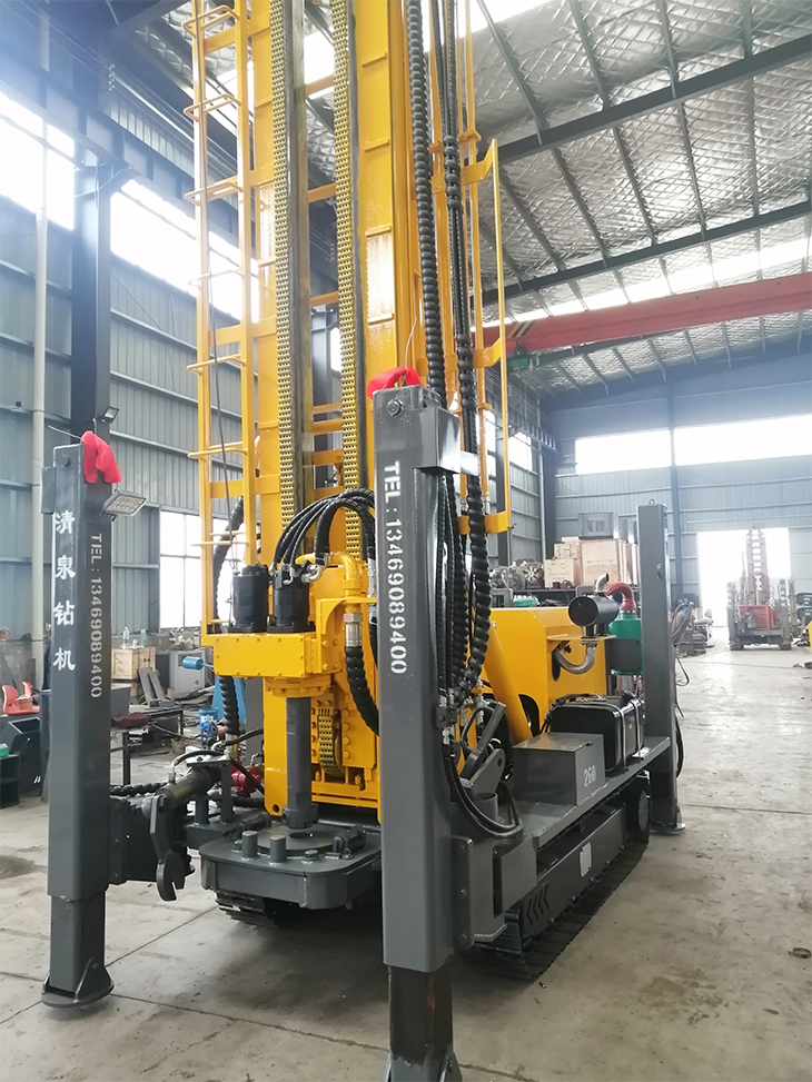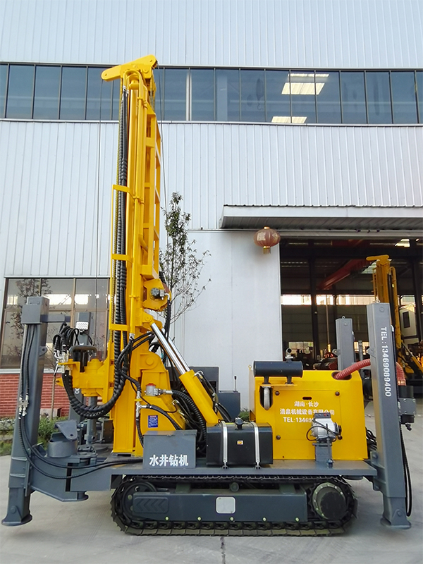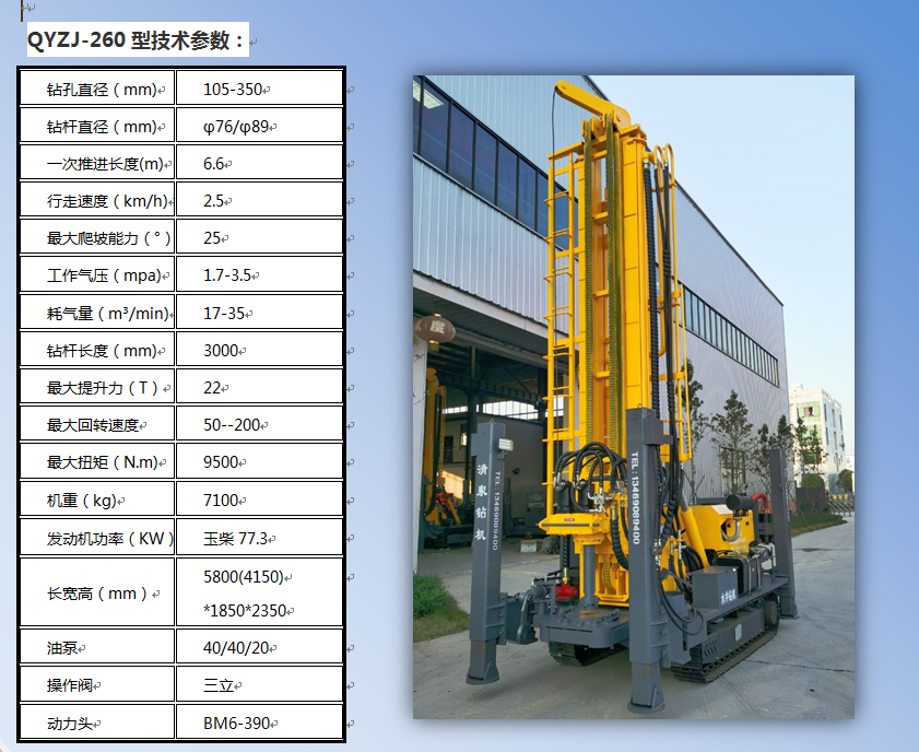清泉260型潛孔水井鉆機 發(fā)動機功率:玉柴77.3千瓦。 油泵:泊姆克三聯(lián)泵。 動力頭馬達: BM6-390。 最大扭矩: 9500 扭米。 最大提升力: 22噸。 操作閥:三立。 整機機重: 7.1 噸。 尺寸:長5.8米(底長4. 15米),寬1.85米,高2. 35米。 鉆孔直徑: 105-350 毫米。 鉆桿直徑: φ 76/φ89毫米(3米)。 一次性推進長度: 6600 毫米。